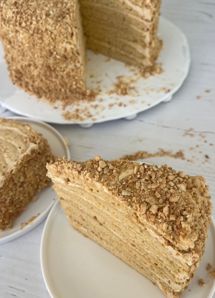 Place the first cake disc on the plate and scoop a generous amount of the honey-cream on top. Spread out evenly not worrying that it will crawl down the sides.