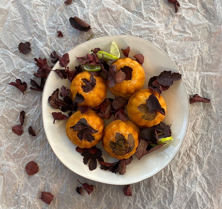 Prepare your mould (or muffin tin) by greasing it with butter and then dusting it with the fresh breadcrumbs. I added fresh cranberry hibiscus leaves to the bottom of my baking moulds as they have a wonderful citrusy flavour and add a beautiful colour and texture to the finished cakes.