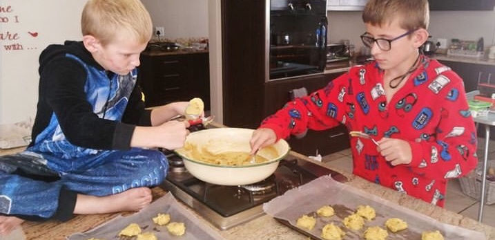 Ottmar and Niklas Wessels baked the chocolate chip biscuits with their mom Carin. The chocolate chips were sold out but they improvised by replacing it with chopped chocolate. Well done boys, you look like true professionals!