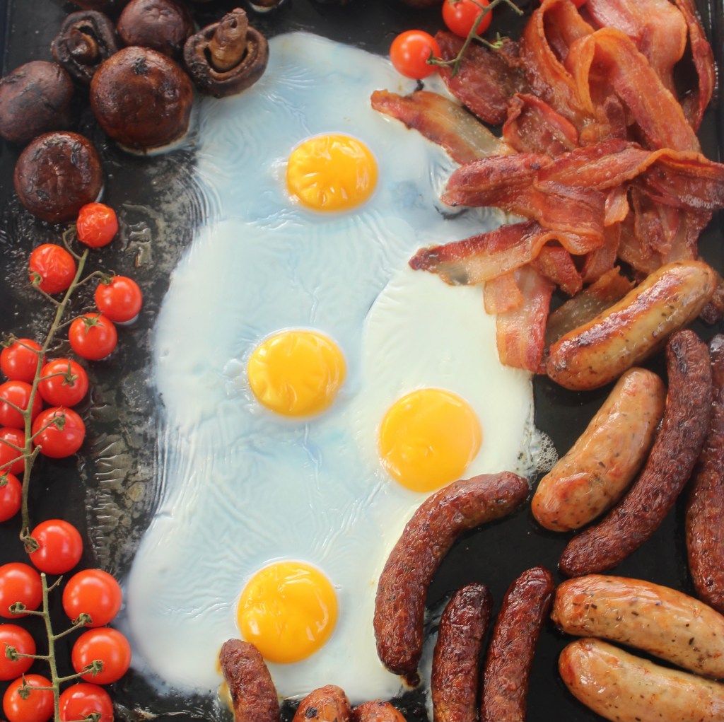 Take the tray from the oven and add the bacon, mushroom and tomato.