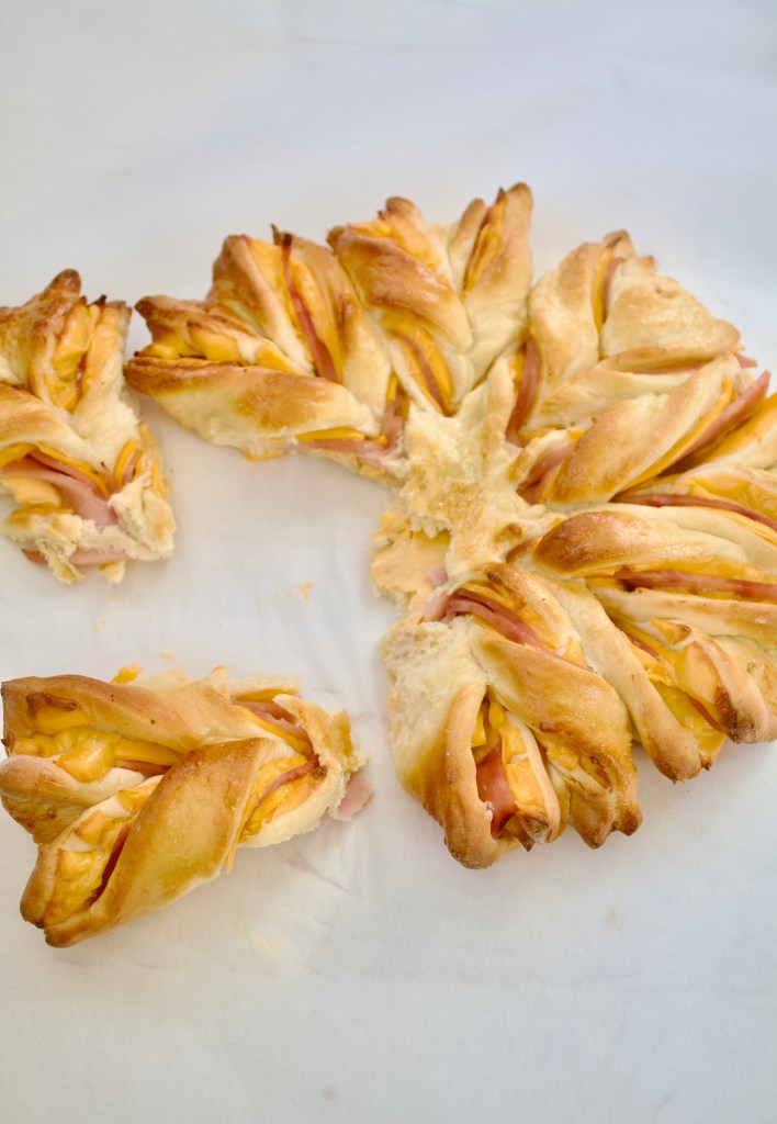 Lay 5/6 slices of cheese over the dough, 5/6 slices of ham and another 5/6 slices of cheese.