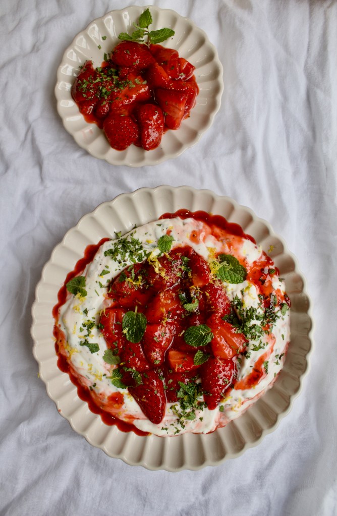Spoon the yoghurt on to a serving plate and spoon the strawberries on top.