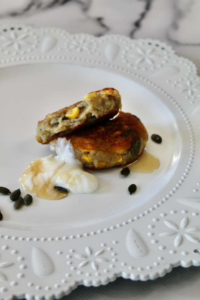 Add all the ingredients to a large mixing bowl and mix through. Place a heavy bottom pan onto medium-high heat and cover the bottom with vegetable oil to heat up. Scoop a tablespoonful of the mixture into the pan and fry for 2-3 minutes before flipping and frying the other side for another 2-3 minutes. Do not overfill your pan as you want the sweet potato to caramelise and fry to a golden, crisp outside. Keep going until all the mixture is used. Serve the cakes with a dollop of yoghurt and honey.