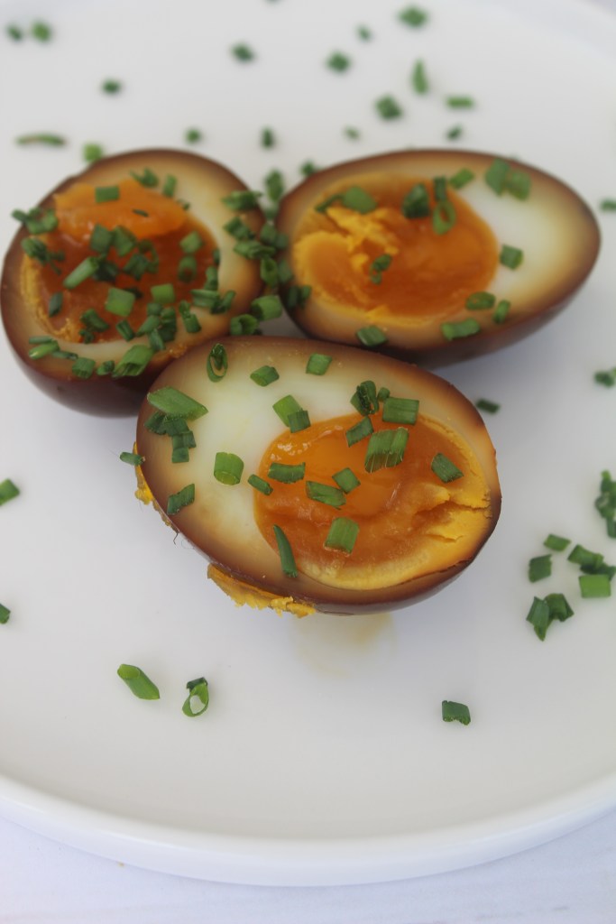 The eggs in these photographs were marinated for 24 hours – very dark colour and strong umami taste!!