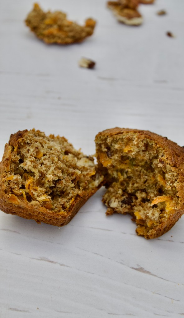375ml bran 125ml boiling water 60ml butter, melted 190ml brown sugar 1 egg, beaten 160ml flour 160ml wholewheat flour 2ml salt 125ml grated carrot 125ml pecan nuts, roughly chopped