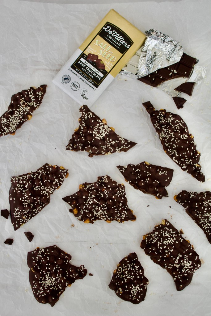Preheat your oven to 180℃ and line a baking sheet with baking paper. Rinse the chickpeas under running water and spread them out on a kitchen towel. Place another towel on top and dry the chickpeas. Spread them out on the prepared baking sheet and spray them with cooking spray. Roast in the oven for 20 minutes, giving them a shake every now and then so that they bake evenly. Remove from the oven and cool completely. Break up the chocolate and add it to a heatproof bowl set over a saucepan with barely simmering water. Allow to melt. Pour the chocolate over the chickpeas and scatter the sesame seeds over. Refrigerate until set, about an hour. Break into shards.