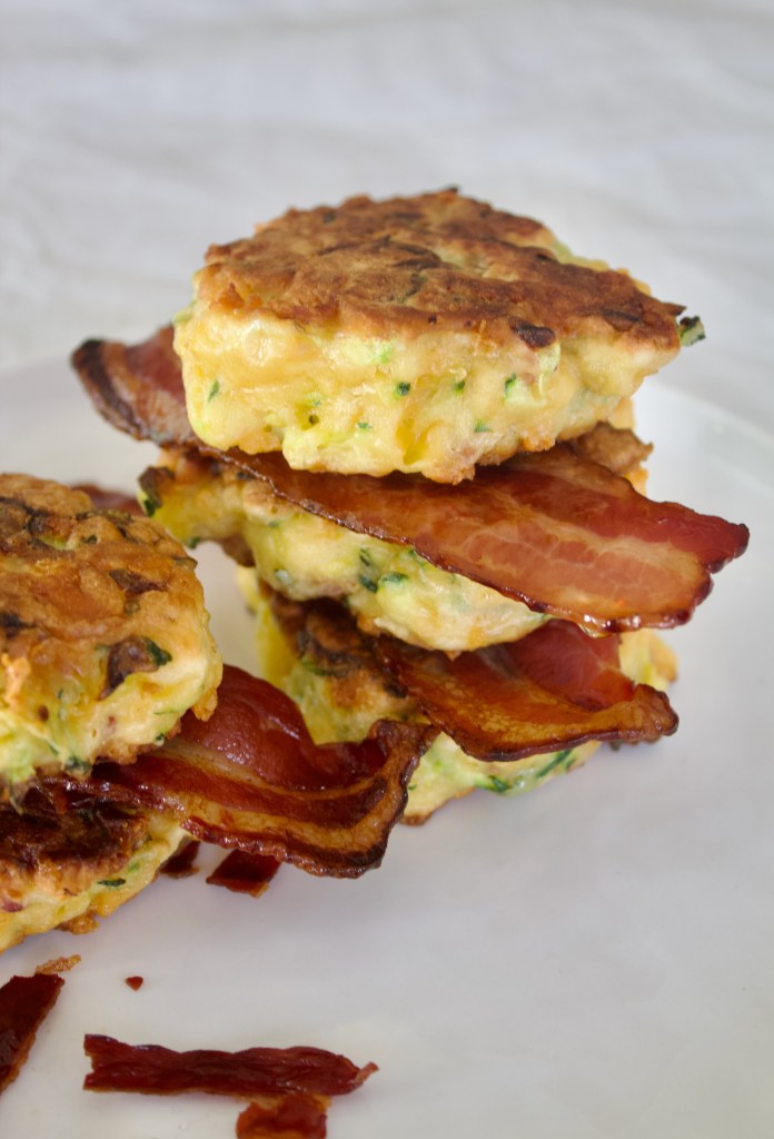 300 – 350g zucchini 15ml salt 375ml grated cheddar cheese 250ml chopped bacon, uncooked 6 eggs, whisked together 375ml flour 7,5ml baking powder vegetable oil, for frying