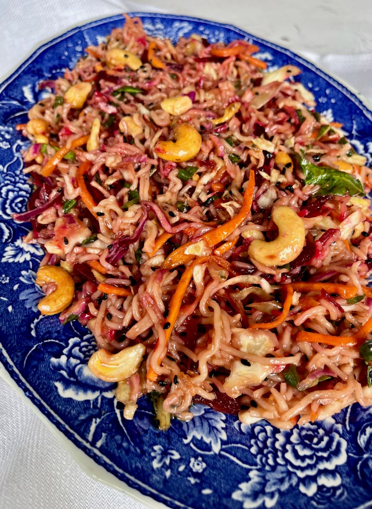Add the cooked noodles, coleslaw mix, cashews and sesame seeds to a mixing bowl and set aside.