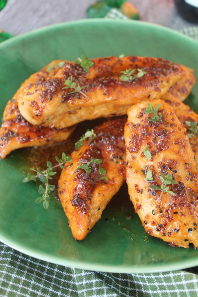 Add the olive oil to a pan set over medium-high heat and sear a few pieces of chicken at a time. (about 4 minutes). Set aside.