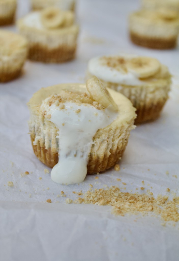 Take the cheesecakes from the paper cups, scoop some whipped cream on top and decorate with slices of banana and a sprinkling of biscuit crumbs.