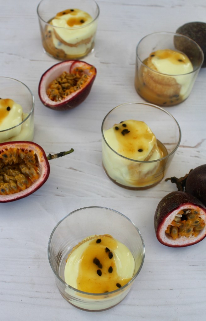 Top the cake with a spoonful of yoghurt and a spoonful of the grenadilla sauce.