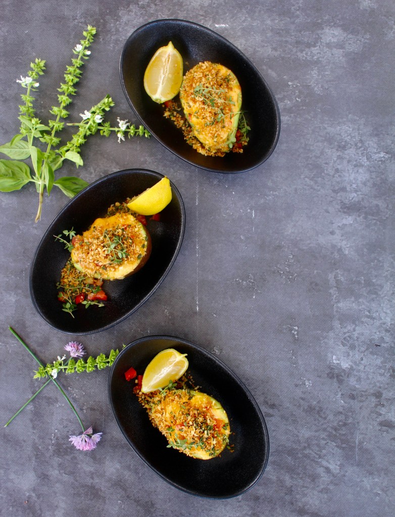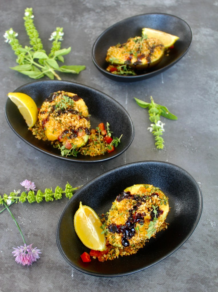 Preheat your oven to 180℃. Prepare foil baking nests for the avocado pear by scrunching strips of aluminium foil into circular shapes where the avocado can rest without tilting. Be careful not to cut your hands!!! Place the nests on a baking tray. Cut the avocado pears in half and remove the stone. Place each half on an aluminium nest and spoon 15ml cream cheese into the hollow. Mix the chopped onion, tomato and cheddar cheese and divide the mixture in four equal portions. Pile the mixture onto the avocado halves. Place the baking tray in the oven for 10 minutes or until the avocado is warmed throughout and the cheese has melted. Spoon a generous amount of pangrattato onto each avocado portion. Drizzle with balsamic vinegar reduction and serve slightly warm.