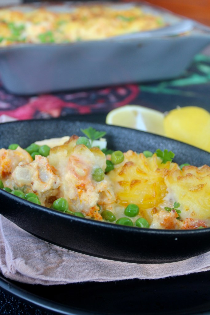 2 eggs 6 large potatoes, peeled and diced a pinch of nutmeg 120g butter, cuber 200g frozen peas 1 onion, chopped 2 carrots, finely chopped 250ml cream 80g cheddar cheese, grated 15ml lemon juice 5ml granulated mustard 62ml parsley, chopped 500g haddock, cut into 2cm x 2cm pieces