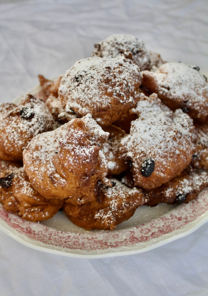 Add the warm water and sugar to a bowl and stir to dissolve the sugar. Sprinkle the yeast over and stir again. Leave to stand for 10 – 15 minutes. Add the flour and 60ml sugar to a very large bowl. Add the eggs and yeast mixture and whisk together. Now pour in the warm milk a little at a time, in between whisking. Keep adding milk and whisking until you have a smooth batter. Cover the batter with a damp tea towel and set aside to rest for 1 hour 30 minutes. Sprinkle the salt and raisins over the batter and fold it through with a spatula. Cover the bowl again and rest for another hour. Heat your oil in a saucepan – about 5cm deep. Dip two tablespoons in the oil, shape a dough ball and slip it into the oil. Fry for 2-3 minutes, turning as they cook. Do this in batches so that you don’t crowd the saucepan. Dust the warm doughnuts with icing sugar and serve warm.