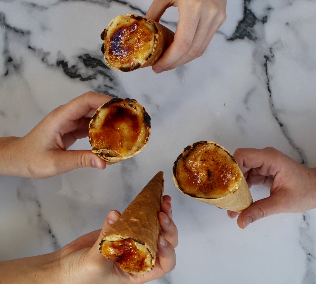 Sugar cones filled with crème pâtissière and then brûléed to a crunchy sweetness makes for a fabulous casual dessert. The crème pât can be made well in advance and kept in the refrigerator, however, assemble the dessert when you are ready to serve.
