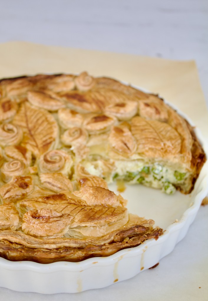 Lay a sheet of filo in the pie dish, allowing it to hang over the sides and brush that with butter as well.