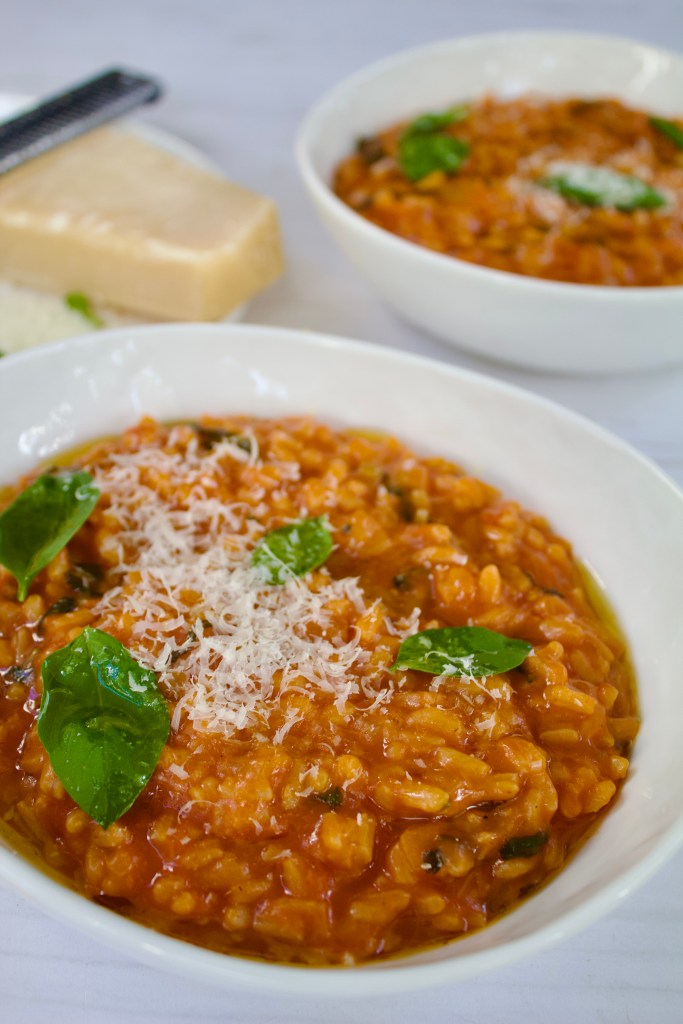 1 litre vegetable stock 30ml olive oil 30ml butter 1 onion, finely diced 3 cloves of garlic, minced 2 x 400g cans of chopped tomato 45ml tomato puree 125ml white wine 250ml arborio rice 45ml grated parmesan cheese and more for serving 125ml basil leaves, finely chopped